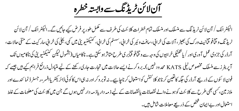 All risks connected and involved with Electronic/Online Trading will be assumed fully by the client. Electronic/Online Trading may from time to time be adversely affected (inter alia) by network congestion, equipment failure, software failure, system breakdown, loss of connectivity, power failure, adverse market conditions, partial execution of order and/or technical glitches/failures (including but not limited to connectivity failures). The Broker has provided alternative means to continue trading in such circumstances such as order placement through dedicated telephone lines connected to KATS Operators which should be used by the clients. Neither the Broker nor any of its Directors or officers, registered representatives and employees, would be responsible or liable in any manner for any losses or damages that may be suffered by the client including those due to the misuse of client information and affairs by unscrupulous person(s).